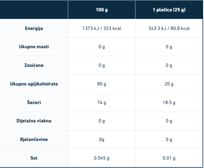 Jelly Bar 4Energy sadrži kombinaciju glukoze i fruktoze u omjeru 2:1, dizajniranu za visoku stopu apsorpcije bez probavnih problema.
