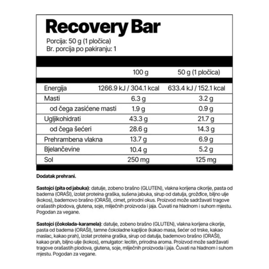 Sastojci (apple pie): datulje, zobeno brašno (GLUTEN), vlakna korijena cikorije, pasta od badema (ORAŠI), izolat proteina graška, sušena jabuka, sirup od datulja, grožđice, biljno ulje (kokos), bademovo brašno (ORAŠI), cimet, prirodni okus. Proizvod može sadržavati tragove orašastih plodova, glutena, soje, mliječnih proizvoda i jaja. Čuvati na hladnom i suhom mjestu. Pogodan za vegane.