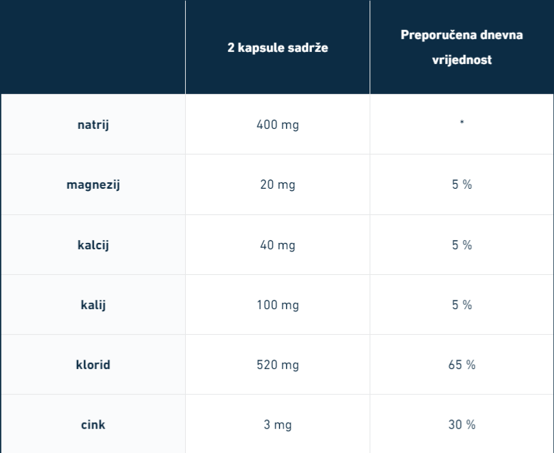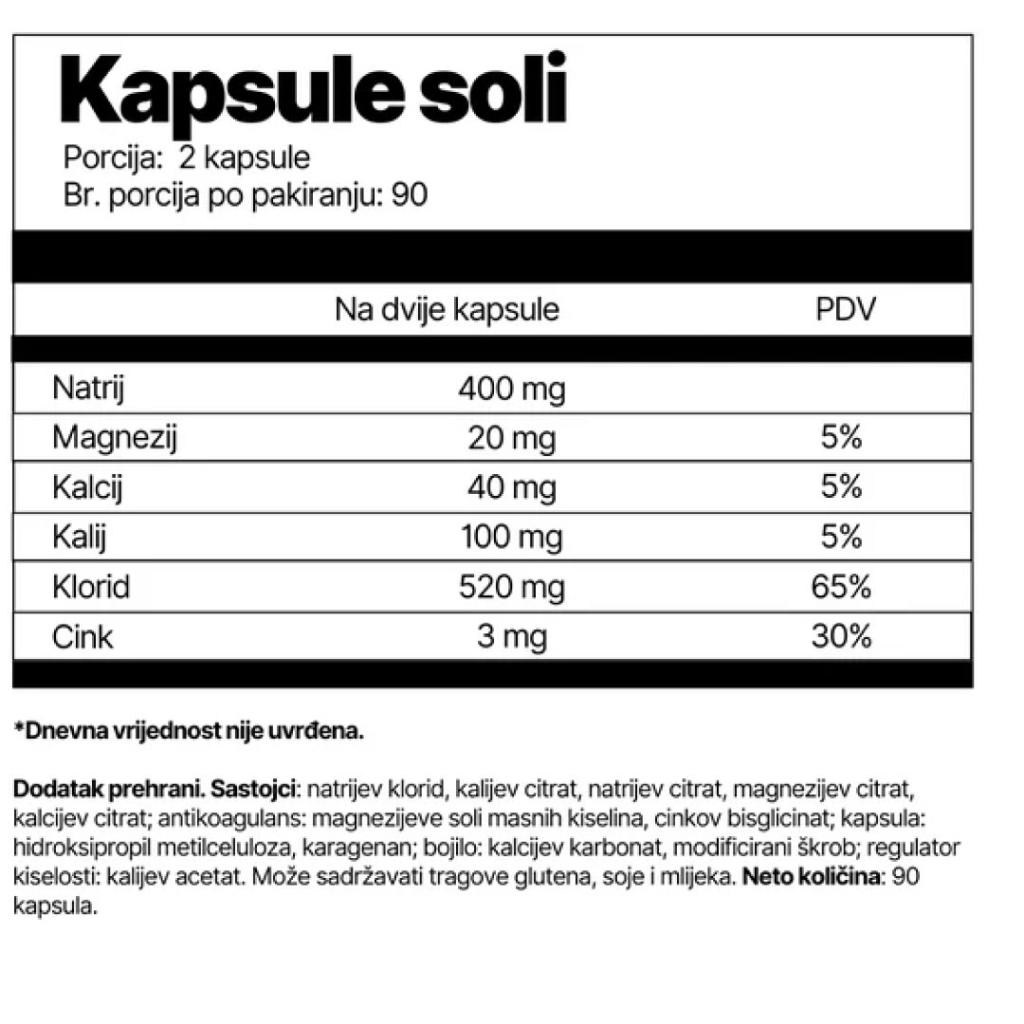 Dodatak prehrani. Sastojci: natrijev klorid, kalijev citrat, natrijev citrat, magnezijev citrat, kalcijev citrat; antikoagulans: magnezijeve soli masnih kiselina, cinkov bisglicinat; kapsula: hidroksipropil metilceluloza, karagenan; bojilo: kalcijev karbonat, modificirani škrob; regulator kiselosti: kalijev acetat. Može sadržavati tragove glutena, soje i mlijeka. Neto količina: 90 kapsula.
