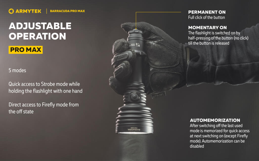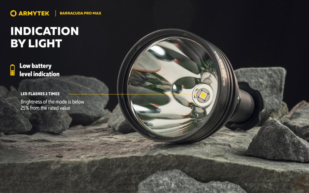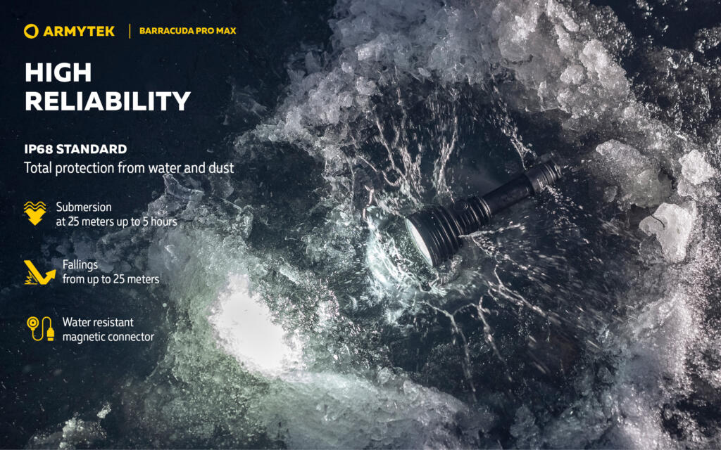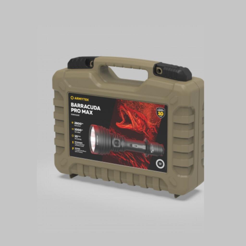 Barracuda Pro Max je lampa sa impresivnim dometom od 1000 metara i snagom svjetla od 2800 lumena. Ovaj model je namijenjen za potragu i spasilačke operacije: usmjereni snop sa jasno izraženim centralnim fokusom omogućava precizno osvjetljavanje objekata i na velikoj udaljenosti. Pažljivo osmišljen dizajn pruža maksimalnu ergonomiju – visoka svjetlina i domet postignuti su pomoću samo jedne LED diode, bez potrebe za dodatnim reflektorima i optičkim elementima. Dvije kontrolne tipke omogućavaju brz i jednostavan pristup svim potrebnim režimima rada.