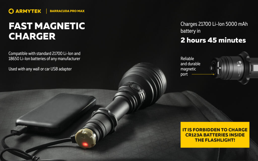 Spremna za upotrebu: u paketu dolazi 21700 Li-Ion baterija od 5000 mAh, adapter za korištenje 18650 Li-Ion ili CR123A baterija, te brzi magnetni USB punjač.
