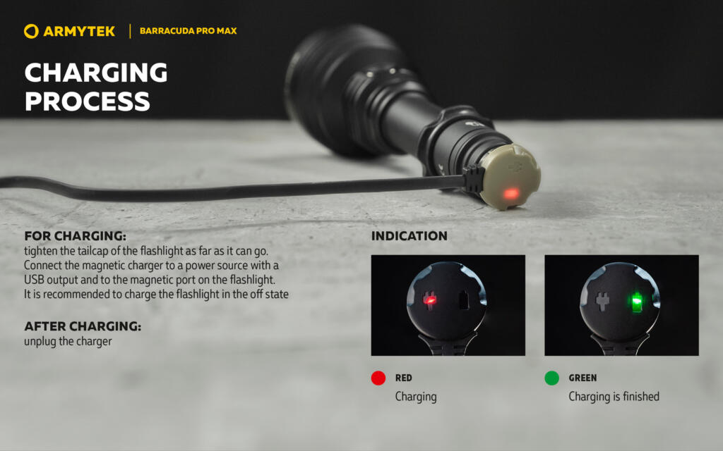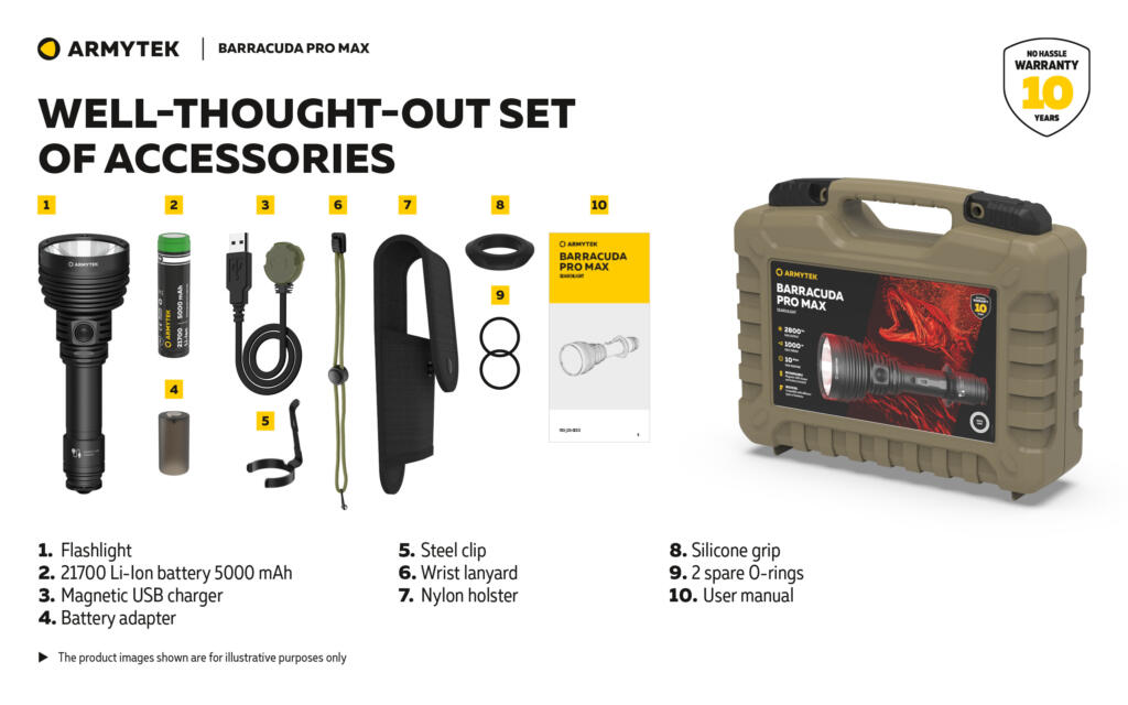 Barracuda Pro Max radi ne samo na priloženom napajanju, već i na bilo kojoj standardnoj 21700 Li-Ion bateriji. Zahvaljujući adapteru, kompatibilna je i sa 18650 Li-Ion baterijom ili sa dvije CR123A litijumske baterije. Ova fleksibilnost napajanja značajno produžava vrijeme rada lampe.