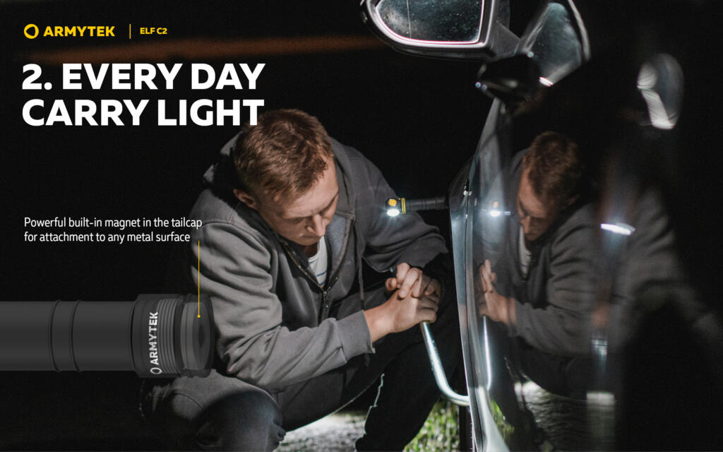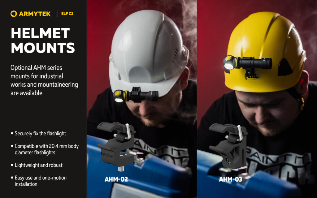 Zahvaljujući ugrađenom magnetu, kao i priloženoj čeličnoj kopči i traci za glavu, lampa se može pričvrstiti na glavu, odjeću ili metalne površine. Elf C2 je također kompatibilna s dodatnom opremom: ABM-01 držačem za bicikl za vožnju i AHM serijom držača za zaštitnu kacigu za industrijske radove i planinarenje.