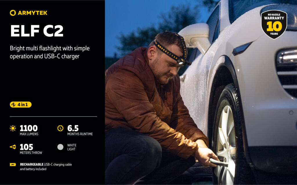 Ovaj multifunkcionalni model sa snagom do 1100 lumena i dometom zrake do 105 metara pogodan je za aktivnosti na otvorenom, sport, popravke i profesionalnu upotrebu. Elf C2 može raditi rekordnih 6,5 mjeseci u režimu minimalne jačine svjetla i neograničeno vrijeme kao stolna lampa — bez baterije, direktno s bilo kojeg uređaja s USB izlazom. Univerzalni USB-C priključak uklanja potrebu za stalnim nošenjem punjača: dovoljno je koristiti standardni USB-C kabel bilo kojeg proizvođača.