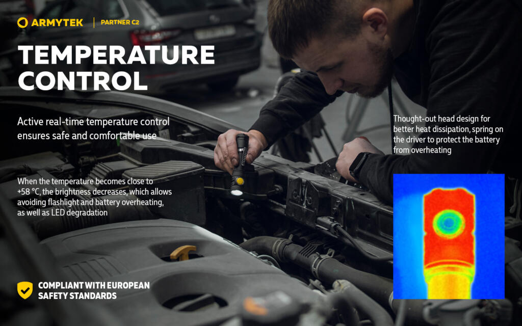 Aktivna kontrola temperature u realnom vremenu: osigurava sigurnu i udobnu upotrebu. Kada temperatura dosegne približno +58 °C, svjetlina se smanjuje kako bi se spriječilo pregrijavanje lampe i baterije, kao i degradacija LED-a. U skladu sa evropskim sigurnosnim standardima.