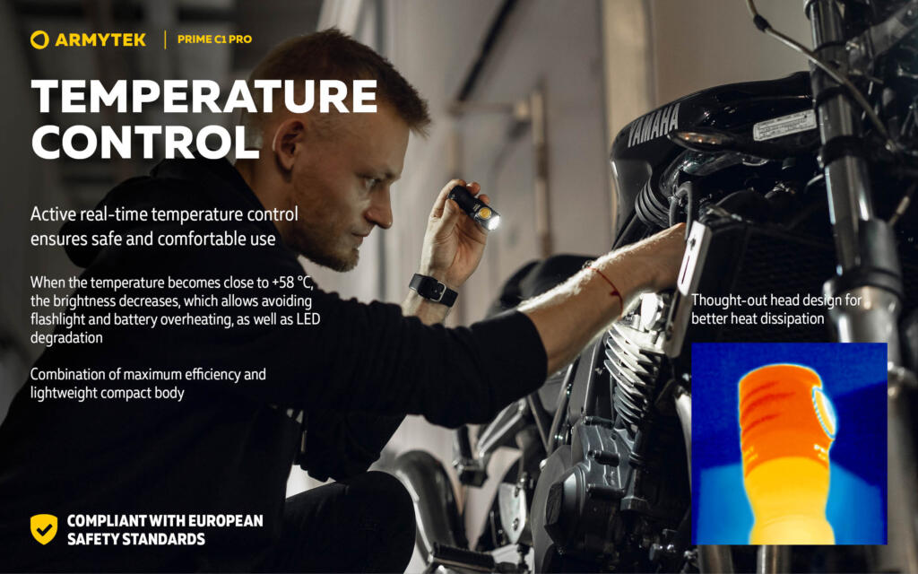 Aktivna kontrola temperature u realnom vremenu: osigurava sigurnu i udobnu upotrebu. Kada temperatura dostigne približno +58 °C, svjetlina se smanjuje, čime se sprečava pregrijavanje lampe i baterije, kao i degradacija LED-a. U skladu sa evropskim standardima sigurnosti.