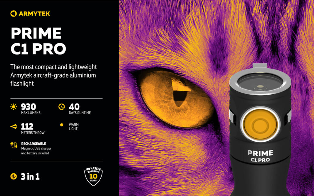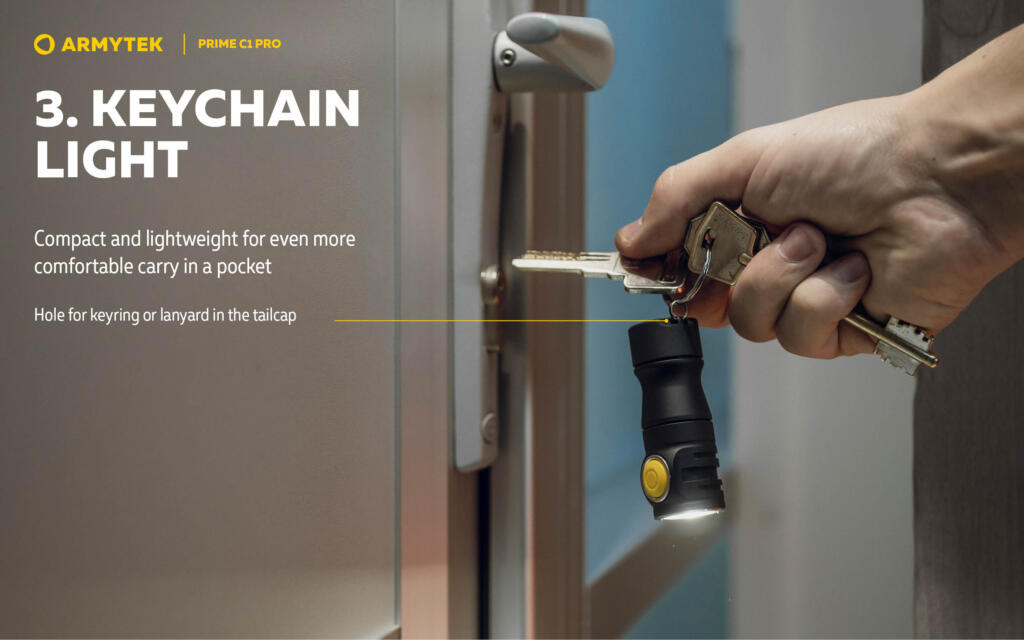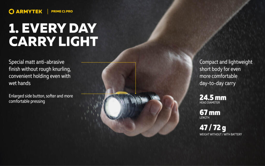 Prime C1 Pro je izuzetno kompaktan, ali moćan izvor svjetlosti za sve svakodnevne aktivnosti. Svjetiljka je praktična za nošenje: ne zauzima mnogo mjesta u torbi, lako stane u džep ili na prsten za ključeve. Klasičan oblik kućišta, kao i rupa na zadnjem poklopcu, omogućavaju korištenje Prime C1 Pro za osvjetljavanje kampa tokom izleta u prirodu: dovoljno je okačiti je na granu najbližeg stabla ili na kukicu ispod krova šatora uz pomoć čvrstog kaiša.