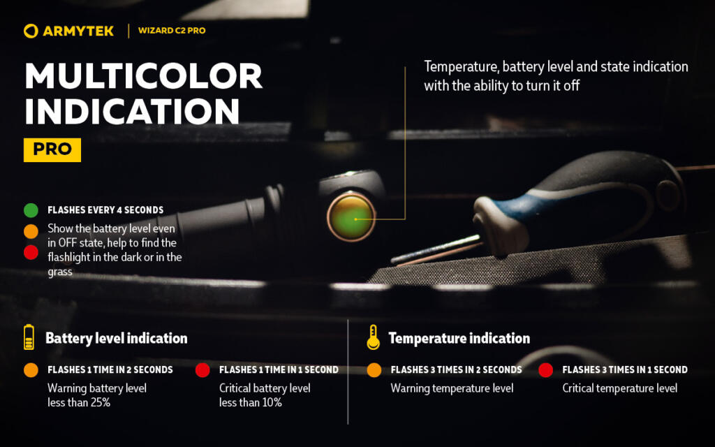 Pro višebojna indikacija temperature, nivoa baterije i stanja lampe.