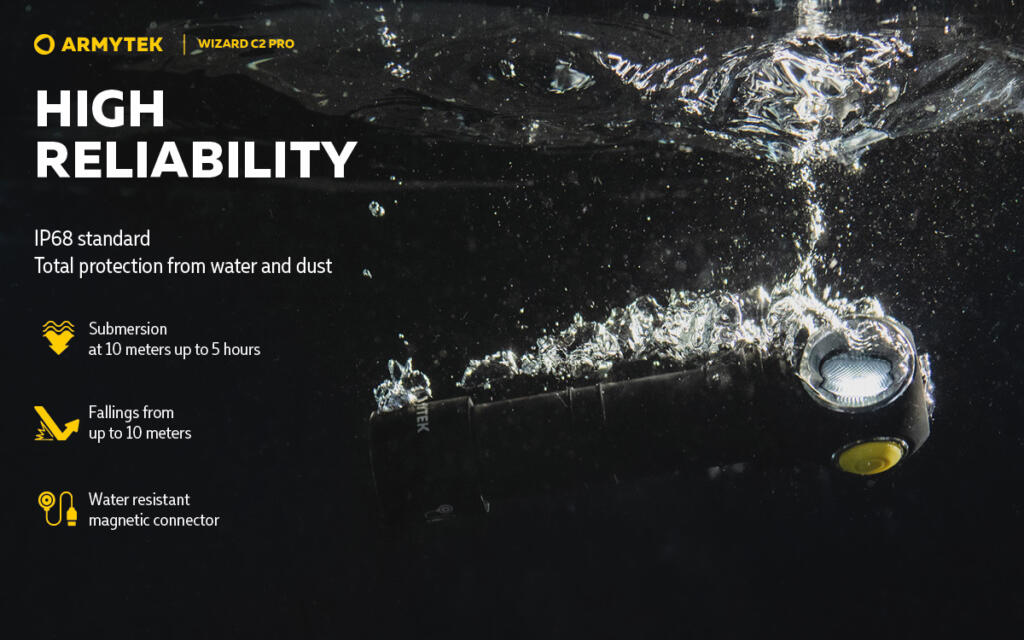 Potpuna zaštita od vode, prljavštine i prašine prema IP68 standardu — lampa nastavlja raditi i nakon uranjanja na 10 metara dubine. Podnosi padove s visine do 10 metara.