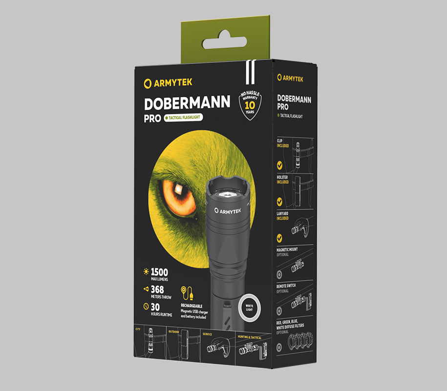Lampa sa svjetlinom od 1500 lumena najbolje odgovara za zadatke na srednjim udaljenostima od 100–200 metara (maksimalna udaljenost snopa je 368 metara). Dobermann Pro je pogodan za duža putovanja i aktivnosti na otvorenom. Kao i svi modeli nove taktičke linije, ovo je spremno visokotehnološko rješenje sa uključenom baterijom i magnetnim kablom za punjenje sa bilo kojeg USB izvora napajanja. Standardno tijelo prečnika 1 inč omogućava korištenje dodatne taktičke opreme: bilo kojih montaža za oružje i originalnih daljinskih prekidača. Za praktičnu svakodnevnu upotrebu, set uključuje izdržljivu najlonsku futrolu, čelični clip i narukvicu.