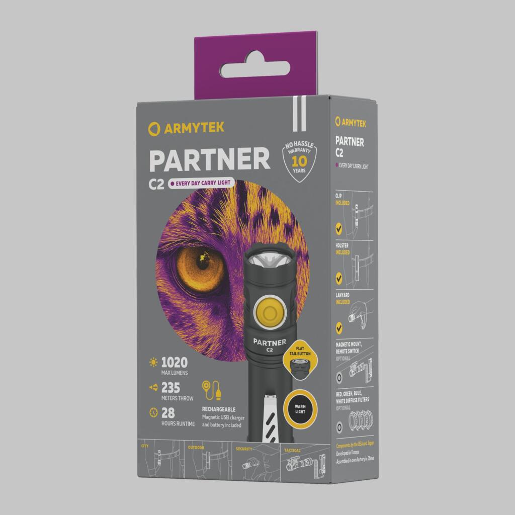 Univerzalni pomoćnik kod kuće, na planinarenju ili ribolovu, Partner C2 može zamijeniti veći taktički model pri lovu ili sigurnosnim patrolama. Tijelo klasičnog oblika opremljeno je sa dva tastera za upravljanje: plosnati taktički taster omogućava brzo uključivanje i isključivanje lampe u taktičkom držanju, a veliki bočni taster mijenja režime rada. Kao i modeli iz taktičke serije Armytek, Partner C2 ima mogućnost stalnog i privremenog uključivanja (polupritiskom taktičkog tastera dok se ne otpusti).