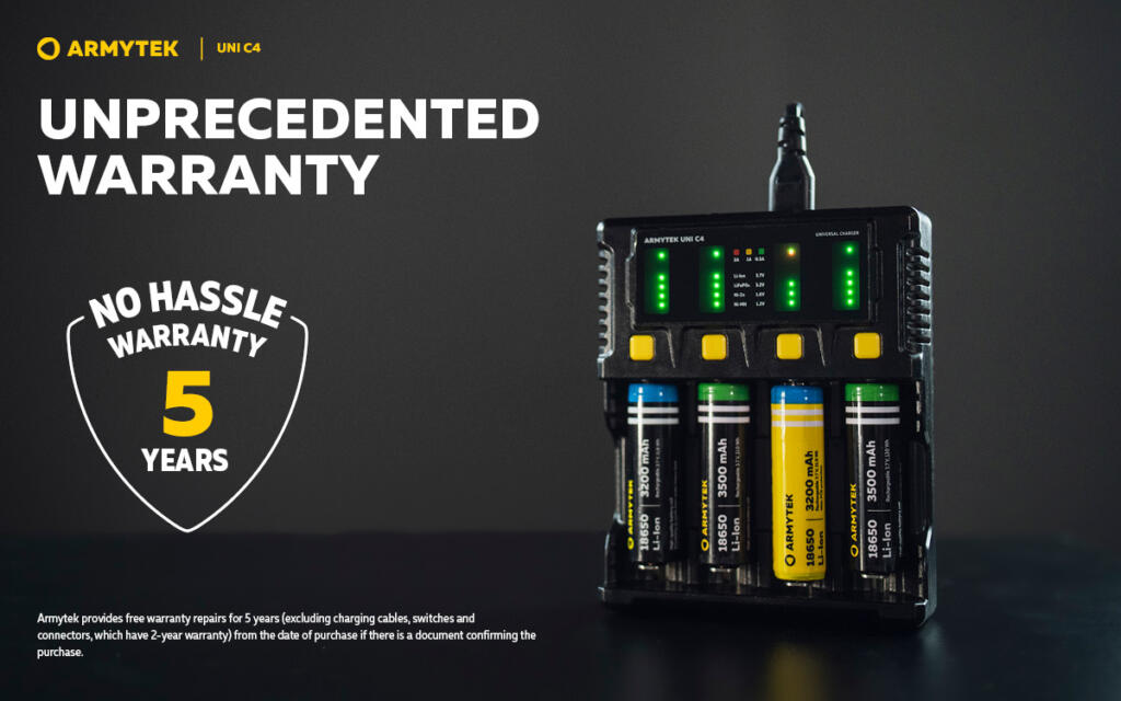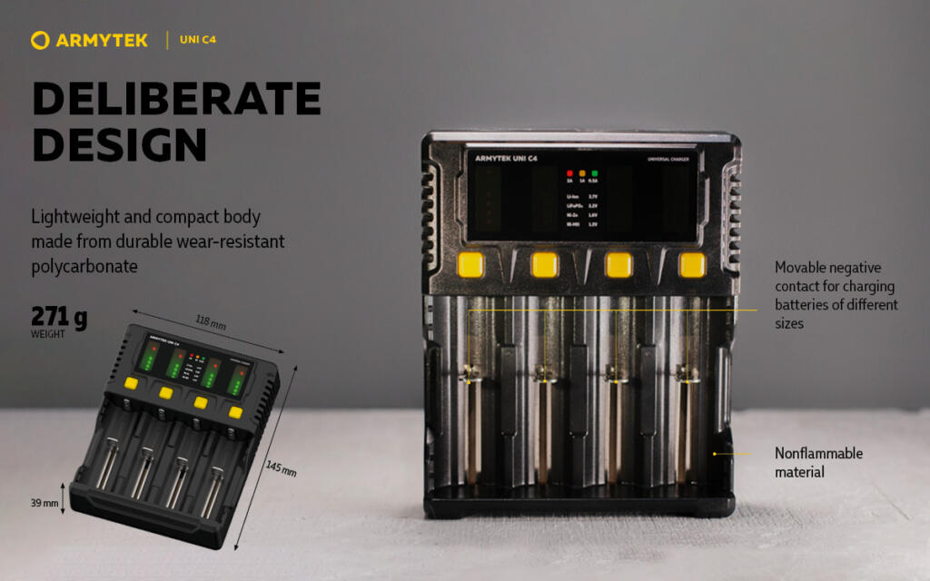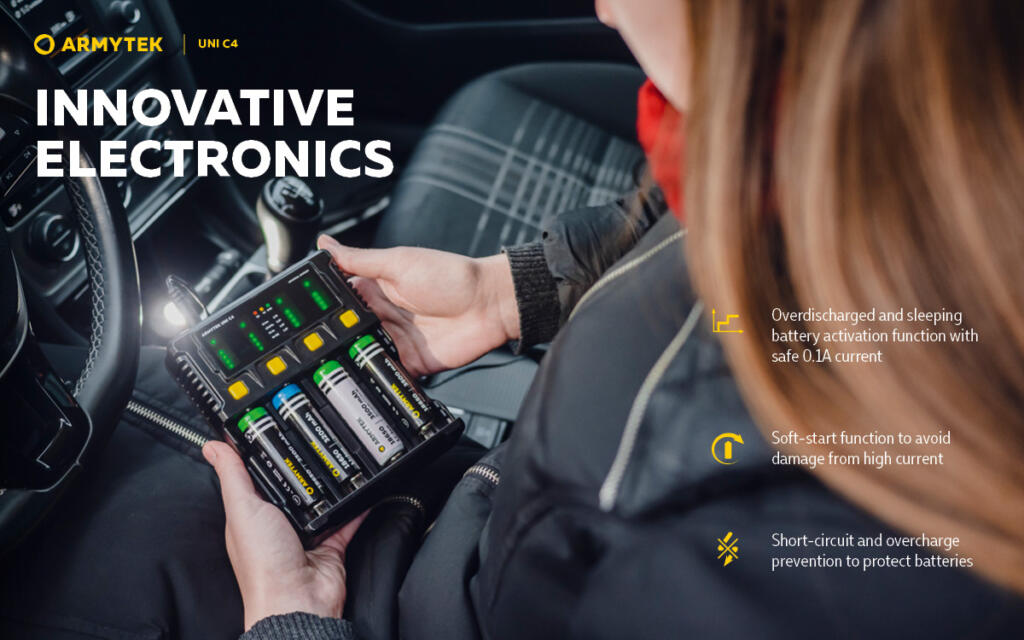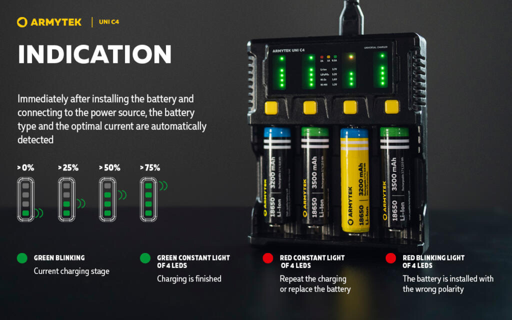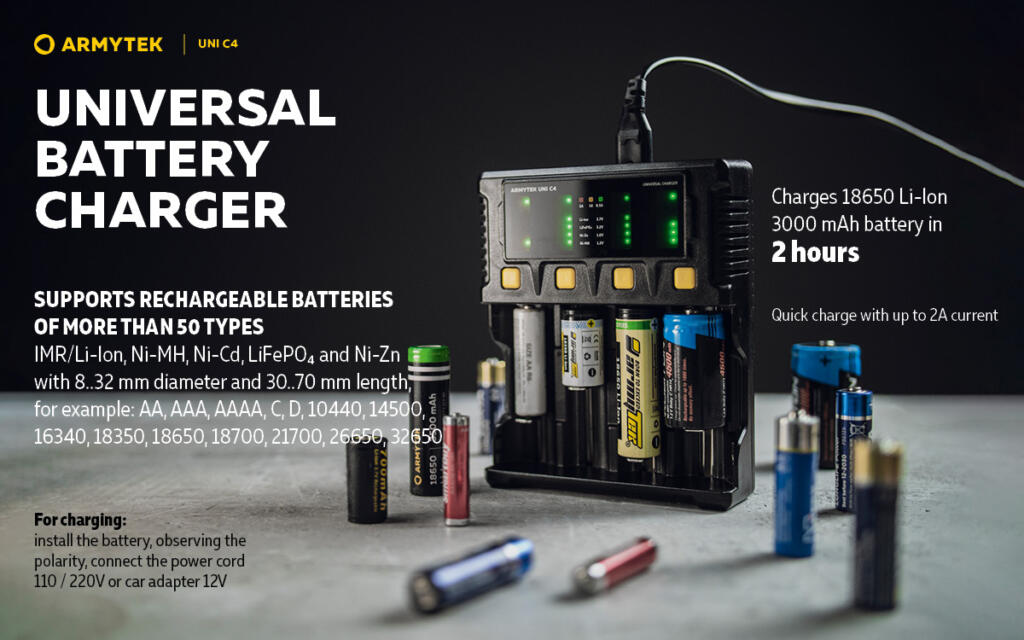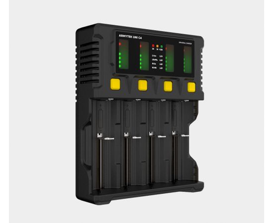 Uni C4 je univerzalni punjač s inteligentnim automatskim prepoznavanjem tipa baterije, nivoa napunjenosti i optimalne struje. Istovremeno puni do 4 baterije različitih tipova sa strujom do 2A. Poseban taster za svaki kanal omogućava jednostavno ručno upravljanje. U setu je uključen adapter za automobil.