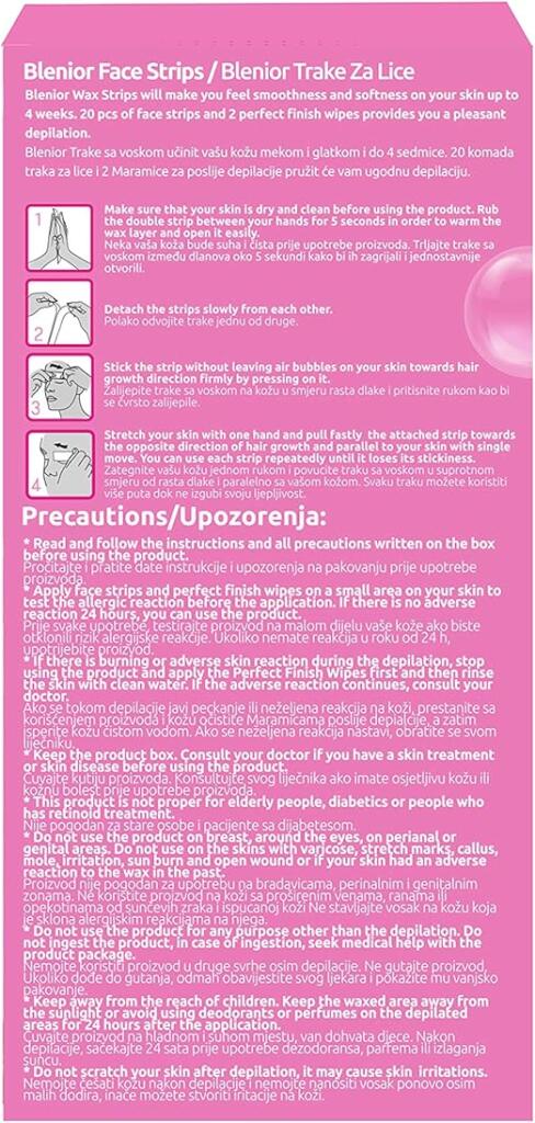 Blenior trake za lice; hvata čak i najkraću kosu bez iritacije kože; pruža glatkoću do 4 sedmice. Trake su dizajnirane da omoguće precizno nanošenje pa su idealne za mala područja poput vaših obraza, brade, obrva i gornje usne.
