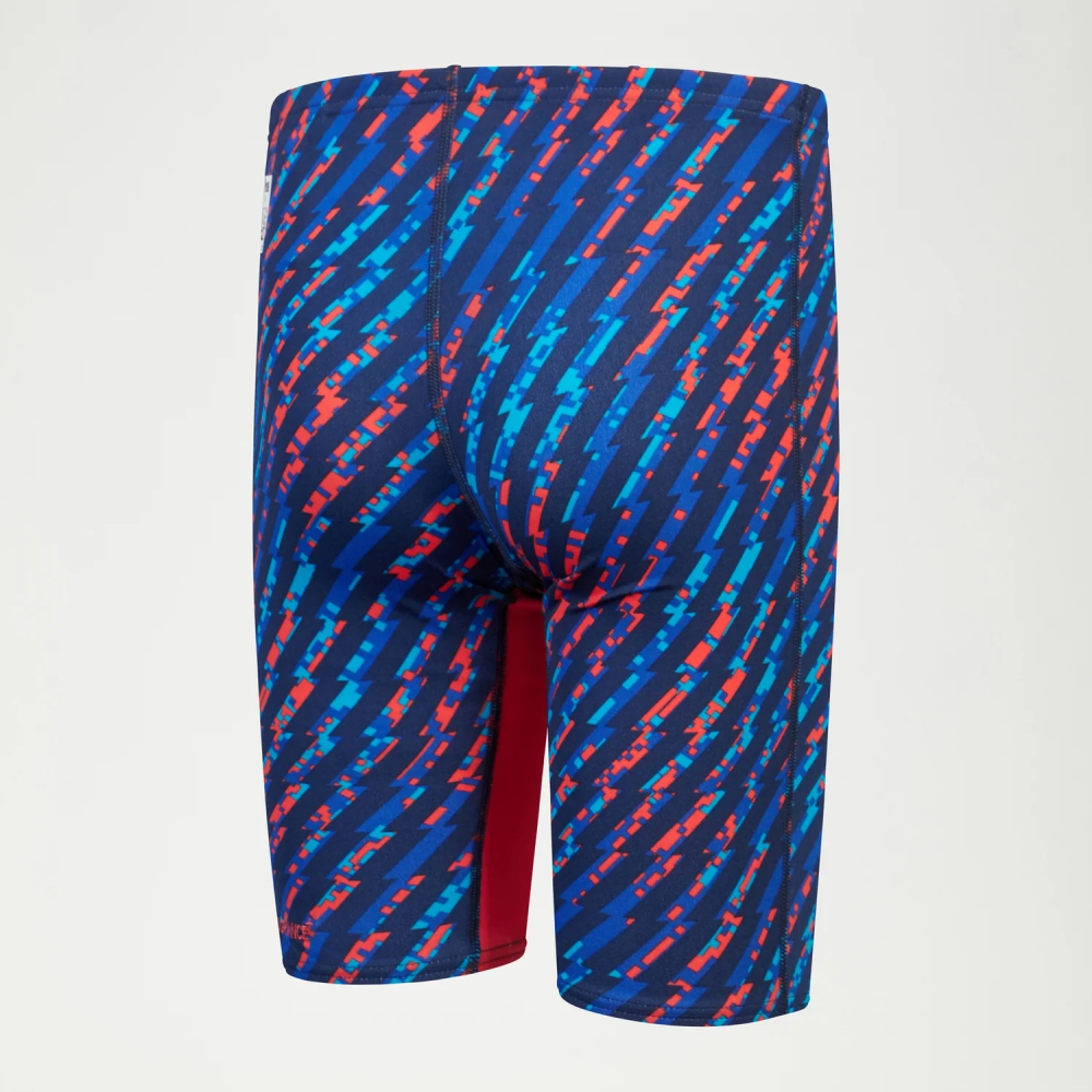 Nae Fastskin Endurance®+ Max High Waisted Jammer odobren od Svjetske vodene federacije (FINA) oponaša linije stila našeg popularnog LZR Valor odijela, tako da naši mladi plivači mogu izgledati i osjećati se kao njihovi plivački heroji dok izlaze na startne blokove. Dizajniran posebno za mlade plivače, odijelo ima moćan plavi i crveni allover grafički print s kontrastnim unutarnjim bojama nogavica. Njegovi šavovi s ravnom bravom i 4-smjerna rastezljiva tkanina osiguravaju udobnost i slobodu kretanja, omogućavajući juniorima da se usredotoče na svoje utrke. Izrađen da traje, 100% je otporan na klor, brzo se suši i dizajniran je da izdrži sve što bacaju na njega na utrkama. Oba poliesterska i PBT vlakna korištena u ovom odijelu izrađena su od 100% postpotrošačkog otpada, poput recikliranih plastičnih boca.