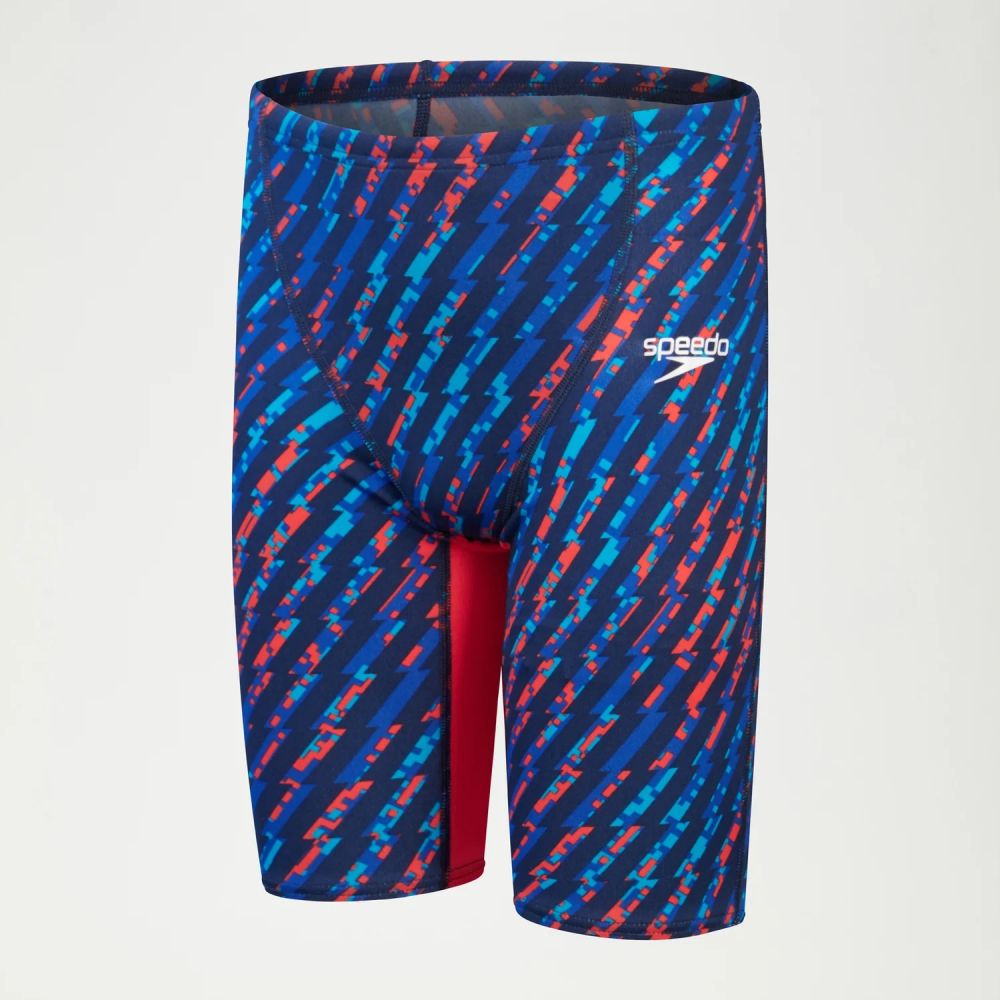Nae Fastskin Endurance®+ Max High Waisted Jammer odobren od Svjetske vodene federacije (FINA) oponaša linije stila našeg popularnog LZR Valor odijela, tako da naši mladi plivači mogu izgledati i osjećati se kao njihovi plivački heroji dok izlaze na startne blokove. Dizajniran posebno za mlade plivače, odijelo ima moćan plavi i crveni allover grafički print s kontrastnim unutarnjim bojama nogavica. Njegovi šavovi s ravnom bravom i 4-smjerna rastezljiva tkanina osiguravaju udobnost i slobodu kretanja, omogućavajući juniorima da se usredotoče na svoje utrke. Izrađen da traje, 100% je otporan na klor, brzo se suši i dizajniran je da izdrži sve što bacaju na njega na utrkama. Oba poliesterska i PBT vlakna korištena u ovom odijelu izrađena su od 100% postpotrošačkog otpada, poput recikliranih plastičnih boca.