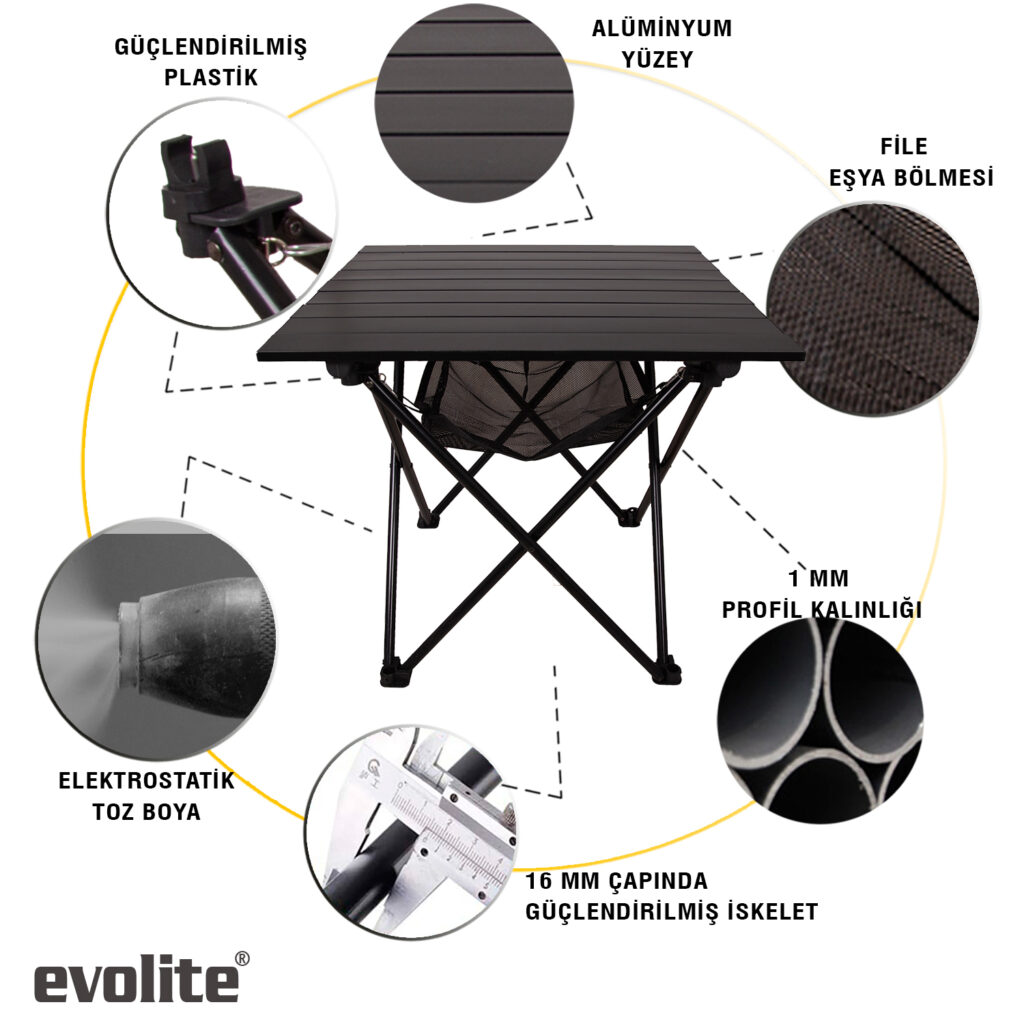 Evolite Nature sklopivi kamping sto ima konstrukciju otpornu na spoljašnje uticaje poput sunca i kiše, a zauzima vrlo malo prostora. Tokom cijelog boravka u prirodi pruža vam udobnost zahvaljujući ultra-čvrstoj strukturi i laganoj težini. Lako staje u prtljag i jednostavan je za nošenje zahvaljujući torbi s kaišem za rame. Ima udobnu površinu koju možete koristiti za obroke ili igranje društvenih igara.