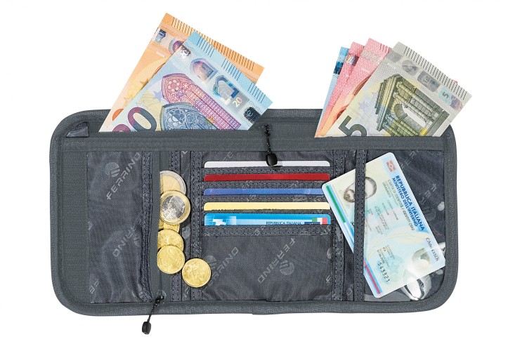 Novčanik pogodan za organizovano čuvanje svih vaših putnih dokumenata, kartica, novčanica i kovanica. Opremljen RFID BLOCKER tehnologijom za zaštitu od kloniranja. | Tkanina: Poliester 210D Diamond Ripstop | Preklopno zatvaranje na čičak | Dupli pretinac za novčanice, od kojih je jedan zatvoren rajsferšlusom | Unutrašnji džepić za kovanice | 5 unutrašnjih pretinaca za kartice | Unutrašnji providni pretinac