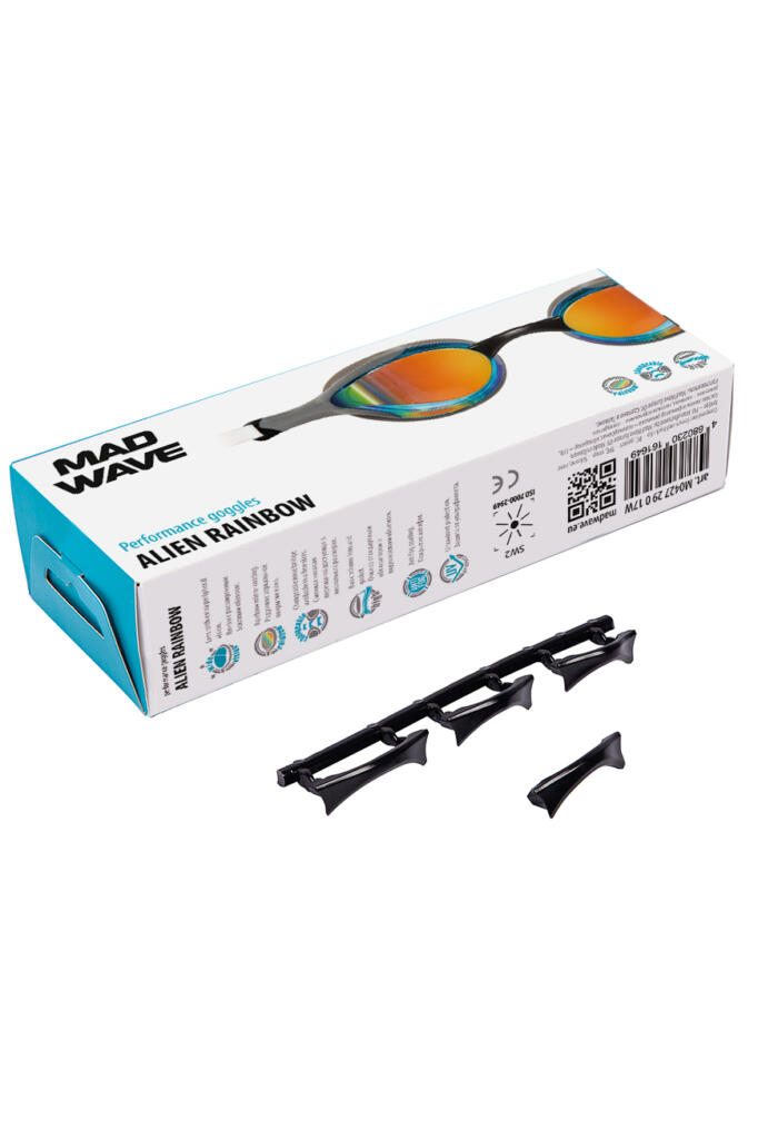 Mad Wave ALIEN RAINBOW naočale dizajnirane su da pruže agresivan, takmičarski izgled uz sve prednosti fitness naočala! Njihov visoki, ekstra mekani dihtung sprječava umor očiju, a posebno dizajnirani ergonomski okvir osigurava savršeno pristajanje i potrebnu udobnost! Hidrodinamičan oblik i inovativna konstrukcija sočiva omogućavaju odlično klizanje kroz vodu i poboljšan vid iz svakog ugla! Sočiva imaju UV zaštitu i Anti-Fog premaz. Dolaze sa 4 izmjenjiva mostića za nos.