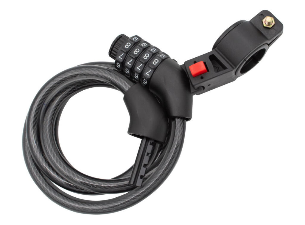 Sigurna i funkcionalna brava Golden Key, 3121100, sa nosačem za montažu bicikla. Prekrivena spiralnim čeličnim zaštitnim kablom sa kombinacijom 4 broja.