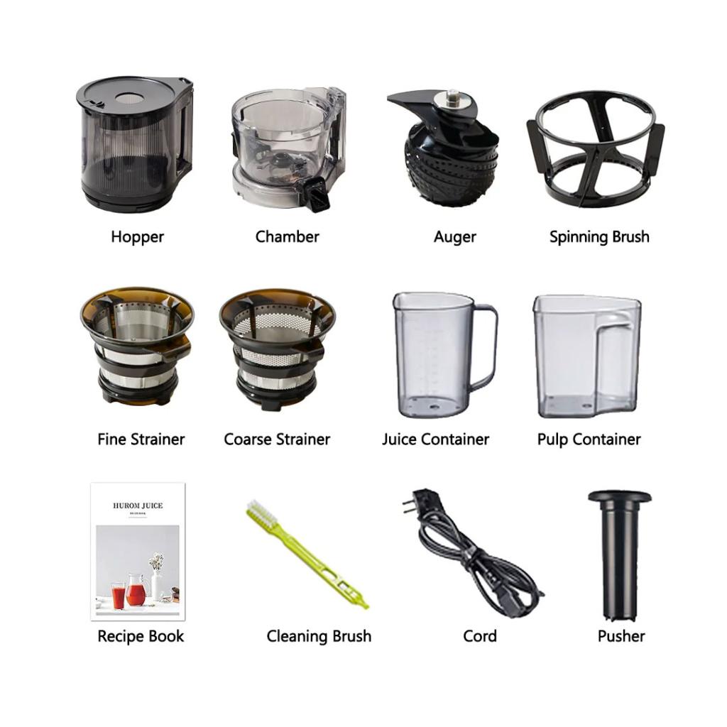 Tritan, koji se koristi za dječje bočice. Filteri od nehrđajućeg čelika koji su manje osjetljivi na bacile. Cjediljke napravljene od netoksičnog materijala pod nazivom ultem. I vijak izrađen od ultema, sposoban da podnese veliki pritisak. HUROM je pažljivo odabrao materijale, vodeći računa o vašem zdravlju.