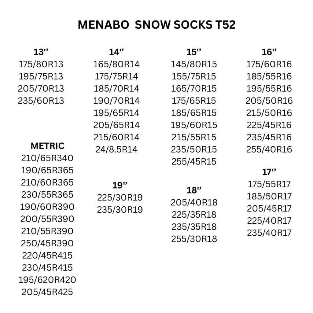 Visokoperformansne navlake za gume: praktična i tiha alternativa klasičnim snježnim lancima. Brzo i jednostavno se postavljaju, a MENABO navlake za gume osiguravaju maksimalno prianjanje na snježnim površinama bez oštećenja vozila. Odobrene u skladu s EU propisima, idealne su za sigurno i bezbrižno putovanje.