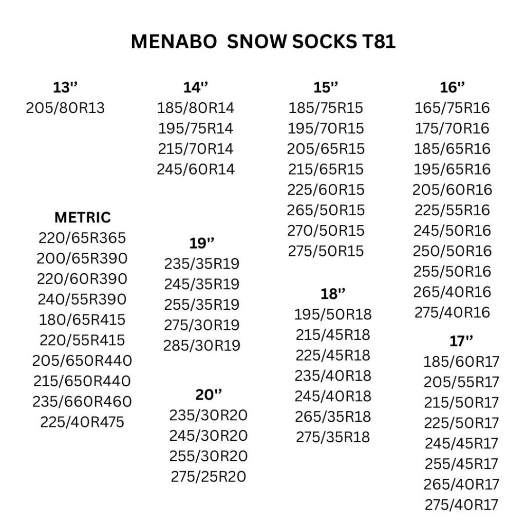 Visokoperformansne navlake za gume: praktična i tiha alternativa klasičnim snježnim lancima. Brzo i jednostavno se postavljaju, a MENABO navlake za gume osiguravaju maksimalno prianjanje na snježnim površinama bez oštećenja vozila. Odobrene u skladu s EU propisima, idealne su za sigurno i bezbrižno putovanje.