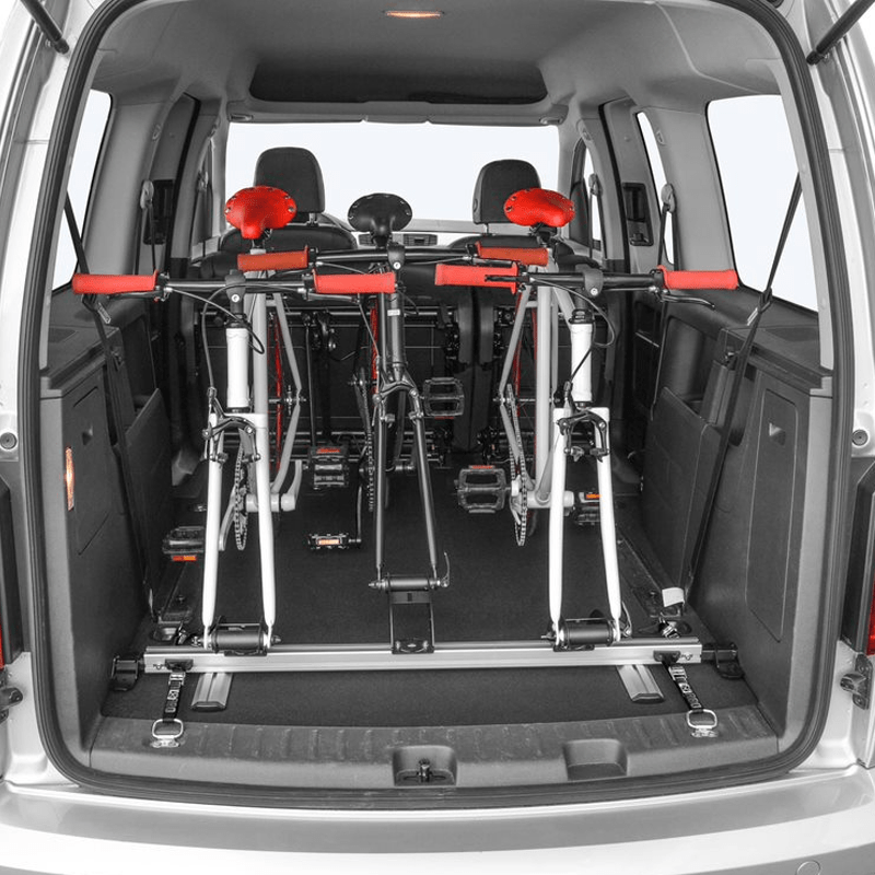 PRO TOUR INDOOR profesionalni nosač za bicikle izrađen je od aluminija sa dijelovima od čelika i čvrste plastike. Može primiti do tri bicikla. Odgovara svim tipovima bicikala, uključujući i Fat Bike. Na sistem zaključavanja mogu se pričvrstiti i tradicionalne i obložene vilice. Preporučuje se za bicikle sa karbonskim okvirom i/ili sa prednjom disk kočnicom.
