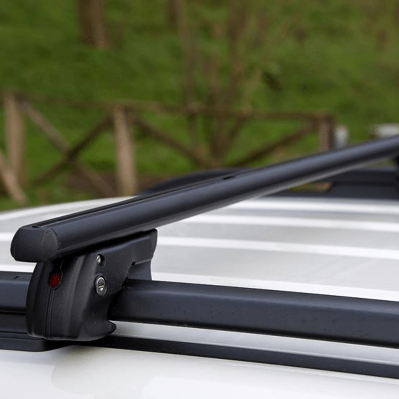 Aluminijumske krovne šipke za automobile sa podignutim šinama, opremljene protivprovalnim sistemom, kompletno montirane, zajedno sa svim potrebnim alatima za brzu i jednostavnu montažu.
