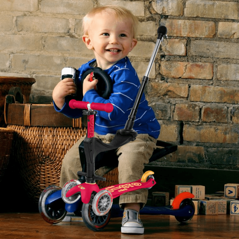 Šta radite kad stariji brat i sestra već voze Mini Micro, a najmlađe dijete se želi pridružiti zabavi, ali je još uvijek premalo? Nema problema – zahvaljujući Mini Micro sa sjedištem! Najmanji mališani sada mogu uživati u jednako mobilnoj zabavi kao i Mini Micro djeca. U ovoj fazi (1-2 godine) romobil mogu koristiti i kao hodalicu u kući. Nakon što je dijete spremno za hodanje i pravu vožnju sa romobilom, sjedalo se može odvojiti od upravljača, što omogućuje vožnju u stojećem položaju sa O-upravljačem. Treća faza je zamjena O-upravljača sa T-upravljačem (upravljač pogodan za djecu koja su već naučila voziti romobil).