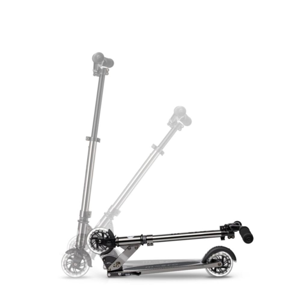 Praktičnost i zabava: Lagan aluminijski okvir i kompaktna veličina čine ovaj trotinet izuzetno upravljivim, što dodatno povećava užitak vožnje. Sklopiva ručka omogućava lako nošenje ili kompaktno odlaganje. Sigurna kočnica ujedno služi i kao blatobran protiv prskanja blata i prljavštine. Osim toga, čvrsti PAGF stalak omogućava trotinetu da samostalno stoji uspravno. LED točkovi bez tragova na podlozi, izrađeni od visokokvalitetnog poliuretana (PU), osiguravaju izuzetno glatku i udobnu vožnju na Micro Sprite trotinetu.