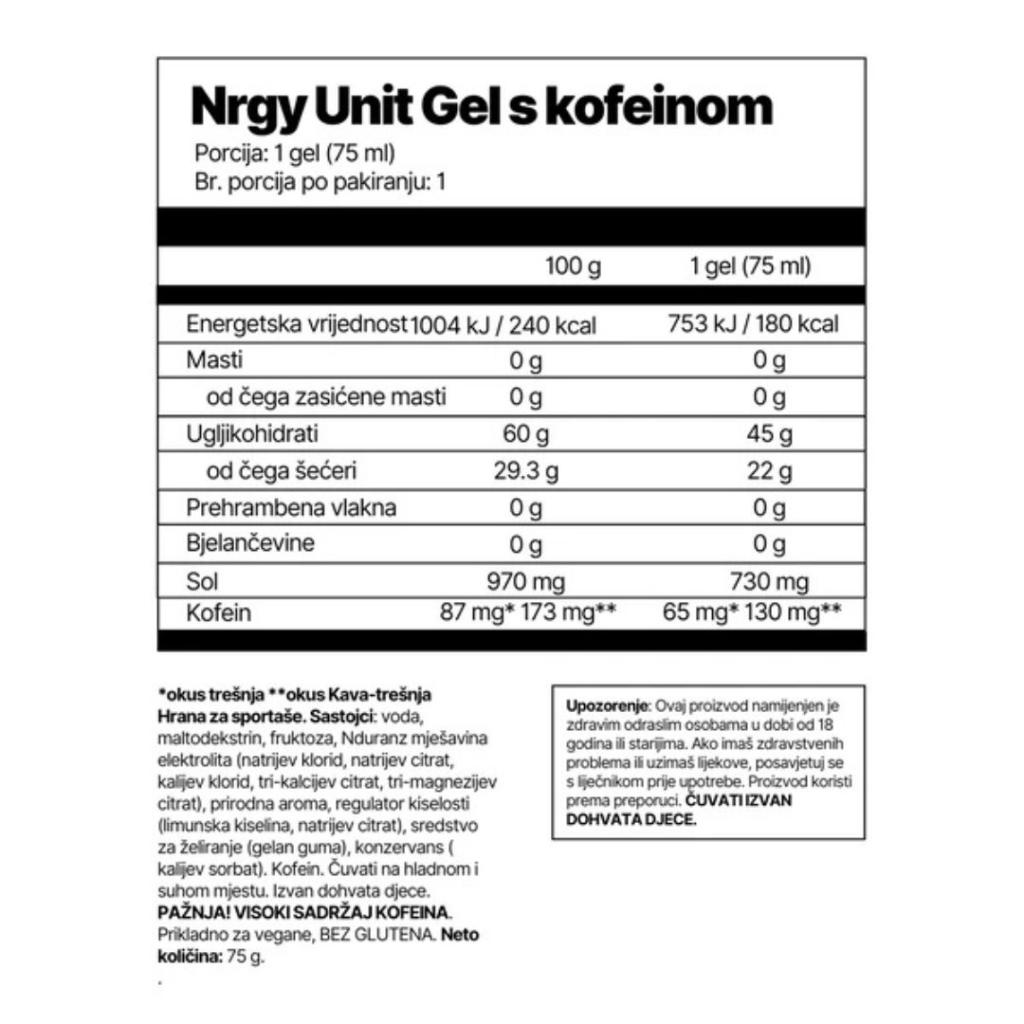 Nrgy Unit Gel s kofeinom pravi je izvor energije za sportaše izdržljivosti kojima je potreban visok unos ugljikohidrata i povećana fizička izvedba sa smanjenim osjećajem umora.