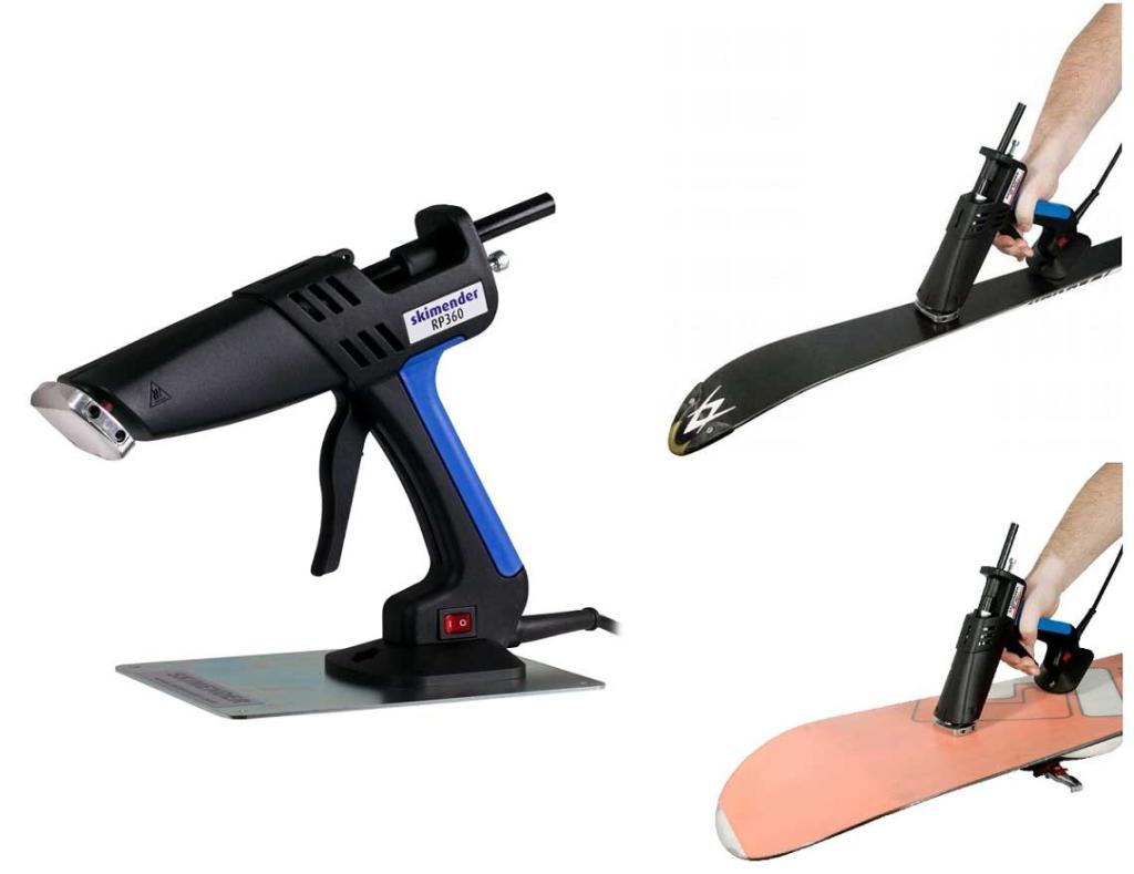 Skimender Base Repair pištolj-elektronički (220V – 375W) s elektronički vođenom mlaznicom. Pogodno za skijanje i snowboarding. S TEC II koji ima grijanu glavu za ekstrudiranje, pad temperature ekstrudiranog materijala je samo oko 5ºC / 41ºF. To znači da ekstrudirani materijal ostaje fluidniji i obradiviji, dajući puno bolju vezu ili zavareni materijal s osnovnim materijalom skija ili snowboarda. Također, ovaj mali pad temperature znači da je potrebno samo nekoliko sekundi da se radna temperatura alata oporavi.