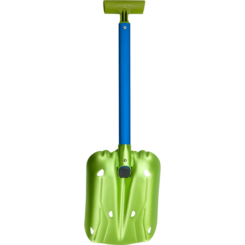 Aluminijska lopata za snijeg, namijenjena za skijaški turizam i alpinizam, s ergonomskom drškom za bolji hvat i veću efikasnost pri iskapanju. Lopata je dizajnirana s rebrima radi povećanja krutosti i s otvorima za upotrebu kao snježnog sidrišta.