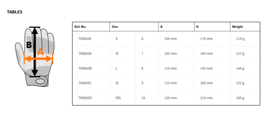 Dvostruki sloj prirodne kože na dlanu i između palca i kažiprsta. Zadnji dio od elastične i prozračne tkanine sa kožnim ojačanjima, ergonomska neoprenska manžetna sa Velcro zatvaračem i otvorom za pričvršćivanje na pojas.