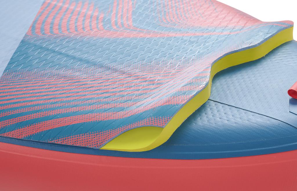 CENTAR STRINGER / TOPLINSKE ZAVARENE TRAKE – OPREMLJEN SA 13CM ŠIROKOM POJAČANOM PVC TRAKOM DUŽ GORNJE I DONJE SREDNJE LINIJE. STRINGER ZNAČAJNO POVEĆAVA KRUTOST PLOČE U ODNOSU NA REDOVNE JEDNOSLOJNE UZRAČNE SUPS. ZAJEDNO SA VANJSKIM TRAKAMA, NOVA KONSTRUKCIJA GARANTUJE UKUPNOST, TRAJNOST I UPRAVLJIVOST.