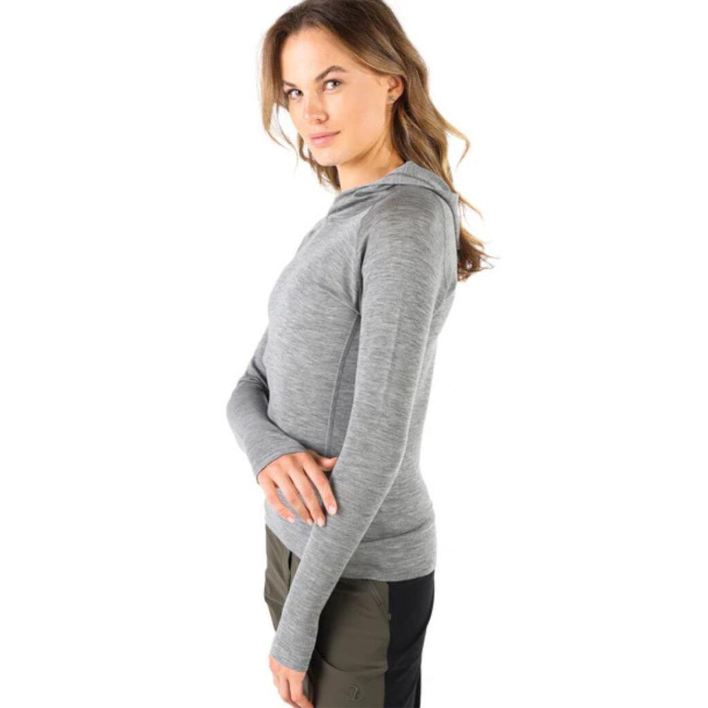 Merino majica s dugim rukavima i kapuljačom je ženski osnovni sloj izrađen od 100% merino vune, koji se također može nositi kao drugi sloj topline ispod jakne.
